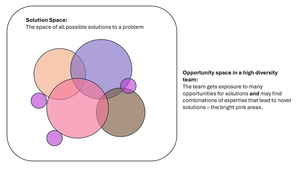 The second team includes more cognitive variation and varied expertise. Their ideas map out more broadly, touching novel ground in the solution space. I think we may also get some interesting collaboration at the edges leading to expansions into opportunity space that is not available to any one person alone (the pink bits). We must remember that some of these edge-case ideas will not be very good, but some of them may be revolutionary.
