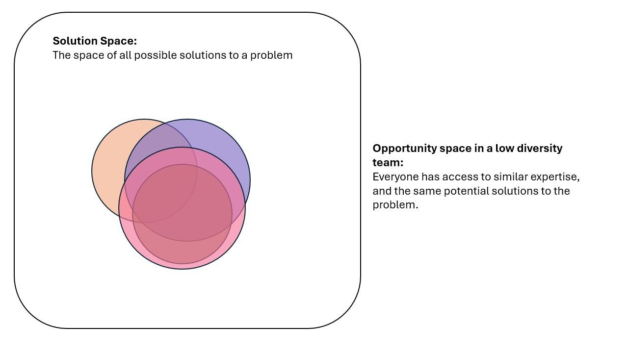 Opportunity space refers to the range of possible solutions a team can generate when working on a problem. Think of it as a landscape of ideas, approaches, and perspectives. Homogenous teams often stay clustered in one corner of that landscape; efficient, perhaps, but narrow. When we broaden the mental models in the room, we widen the map and remove the "fog of war." You discover routes you didn't even know existed.